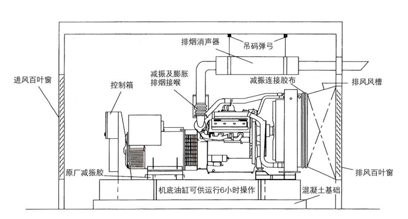 2、柴油發(fā)電機組應(yīng)安裝在平整的混凝土地面上,同時確保機房通風(fēng)散熱效果良好;